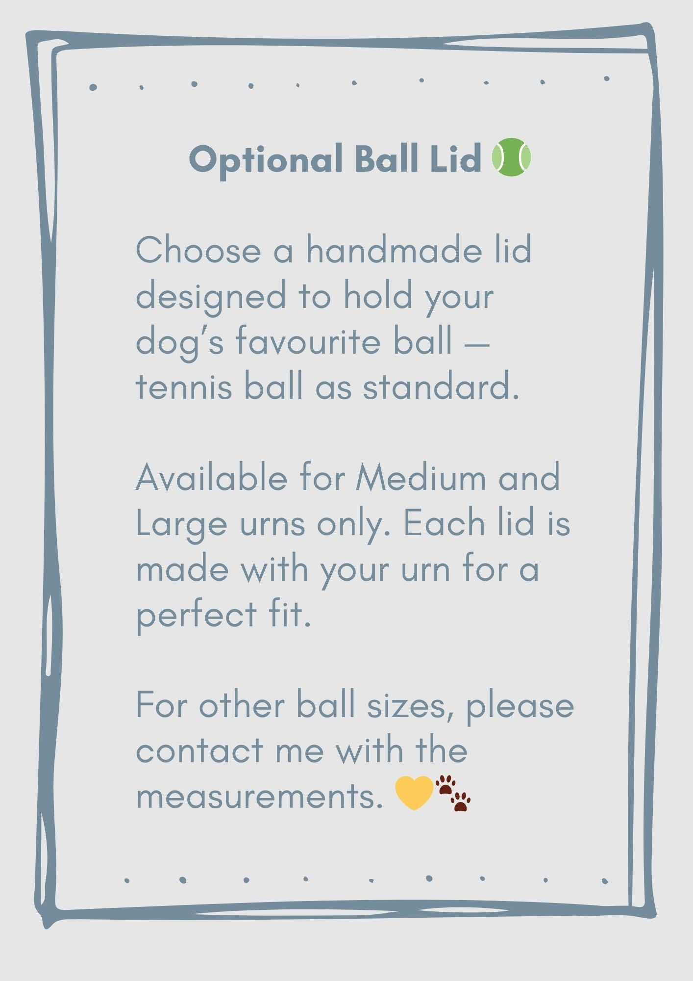 Choose a handmade lid designed to hold your dog’s favourite ball — tennis ball as standard.